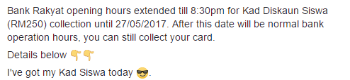 Bank Rakyat Lanjutkan Waktu Operasi Untuk Korang Datang Collect Kad Diskaun Siswa Rm250 Tu